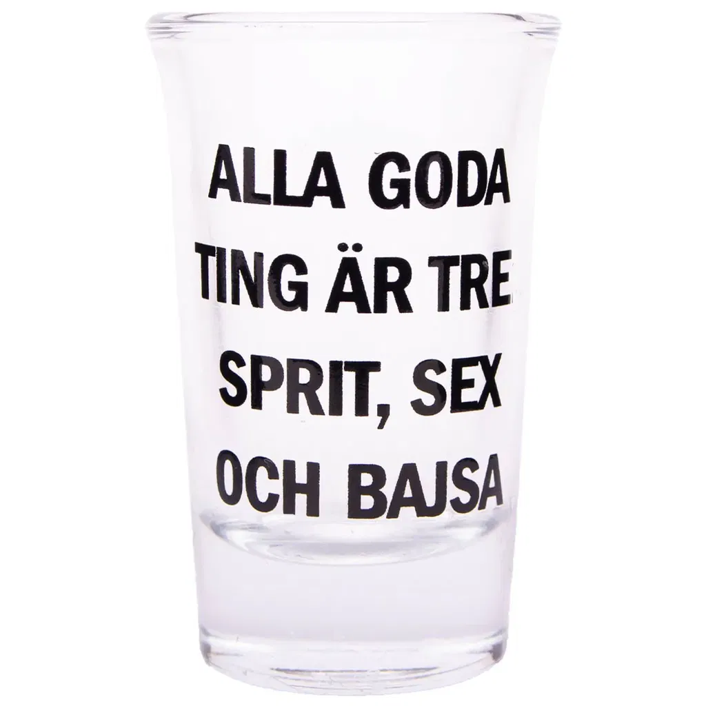 - Snapsglas med texten "Alla goda ting är tre: sprit, sex och bajsa".
