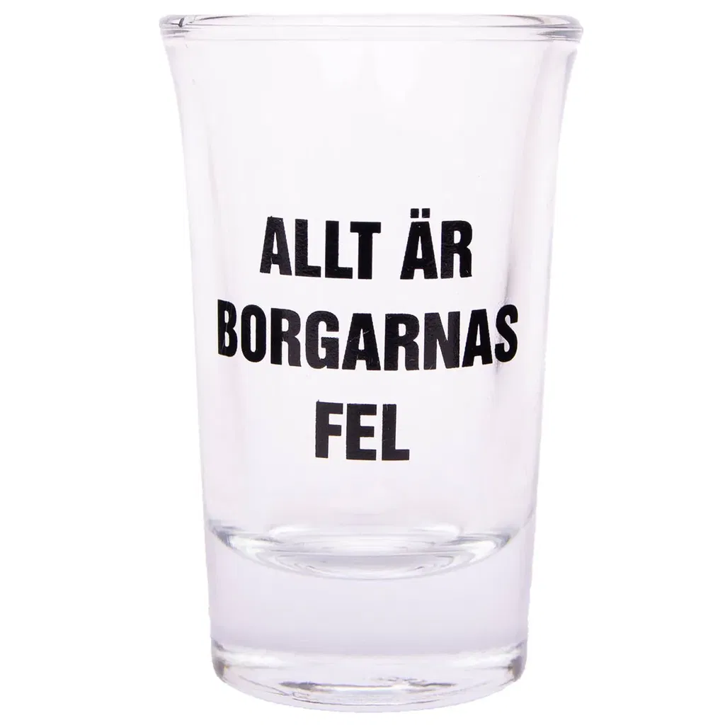 Borgare kallades de som ägnade sig åt hantverk och handel förr, men nuförtiden är det högerblocket inom politiken som oftast kallas för borgare. Och vad har någonsin de gjort för oss? Utan tvekan så måste ju allt ont i världen vara deras fel. Så Ta ett härligt snapsglas med texten allt är borgarnas fel. Roligt, politiskt och satiriskt. Låt dina nära och kära skratta gott åt detta snapsglaset.