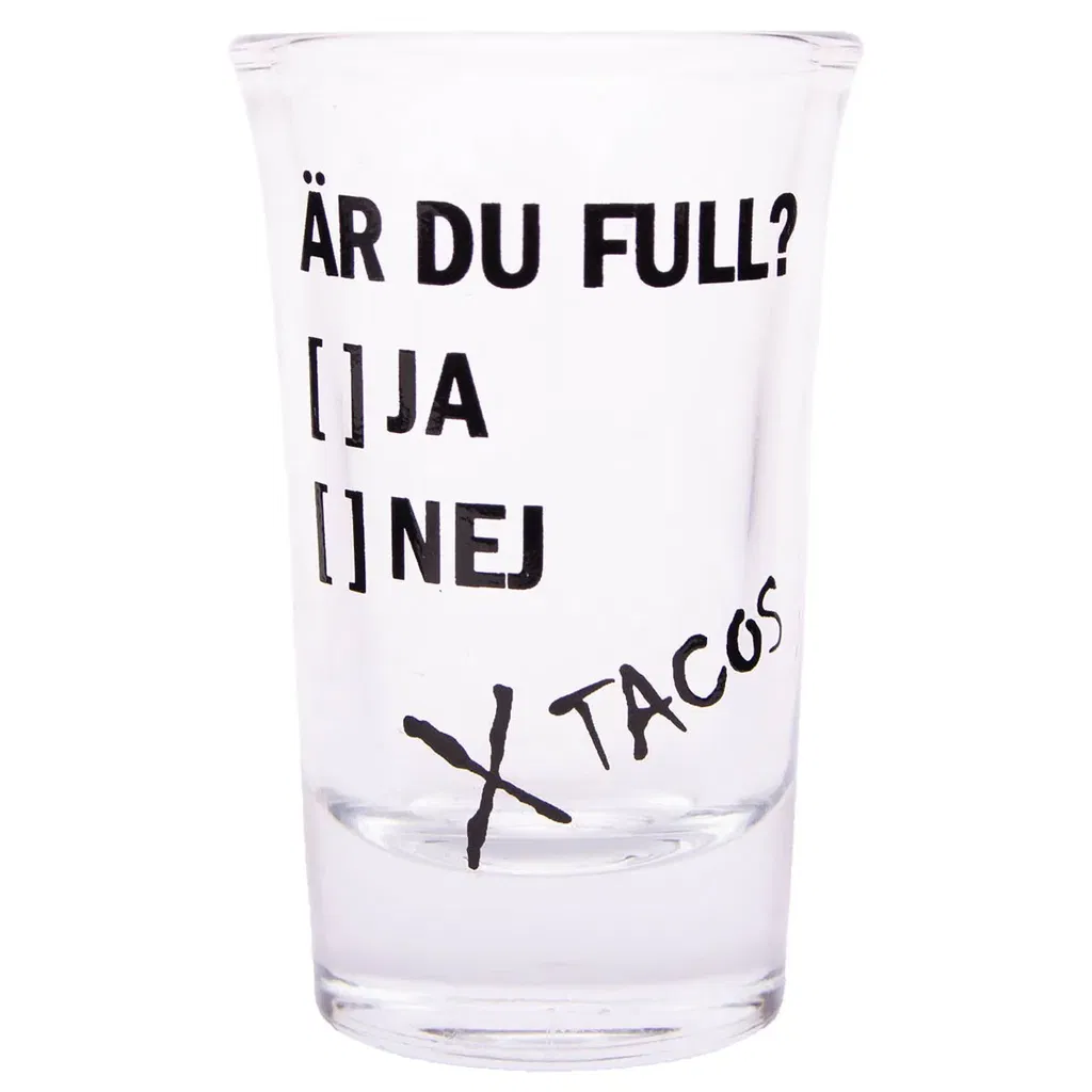 - Snapsglas med texten "Är du full? Ja Nej Tacos".