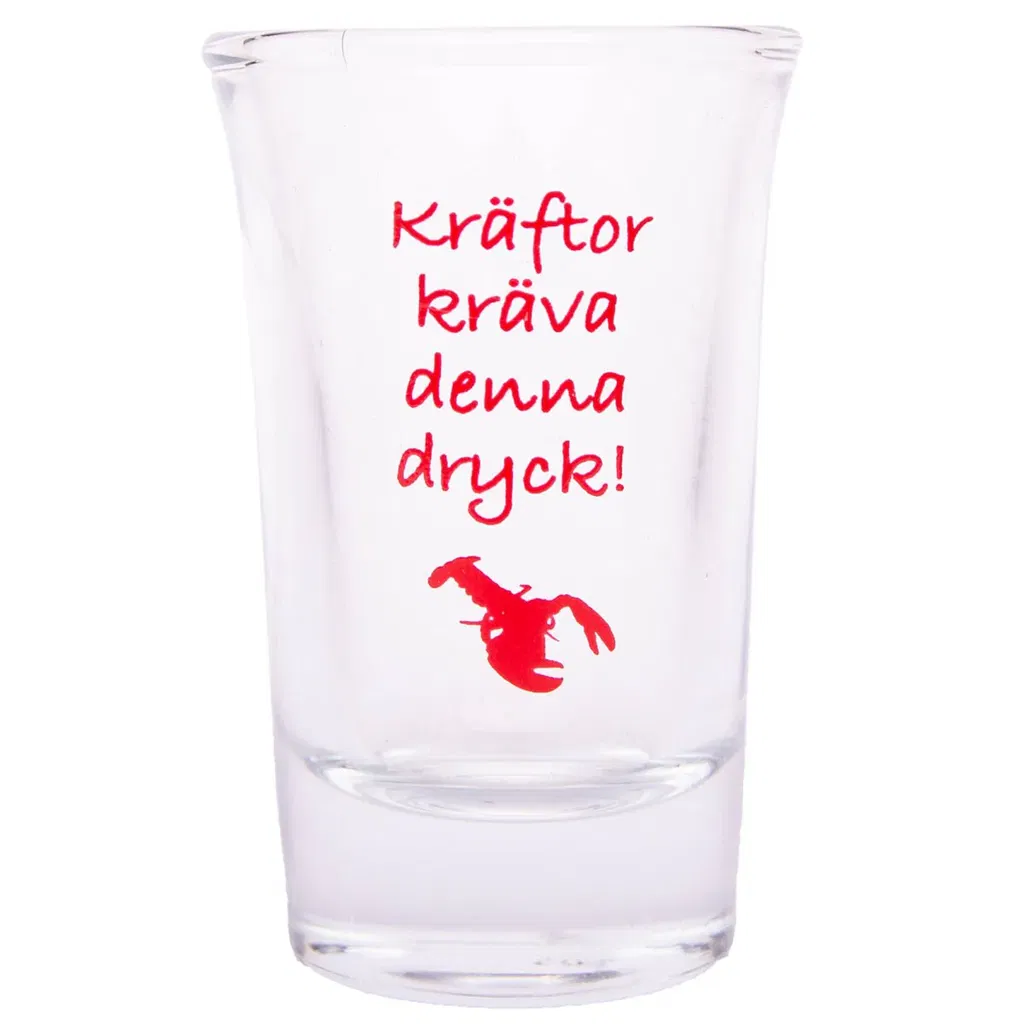 • Snapsglas med texten "Kräftor kräver denna dryck".