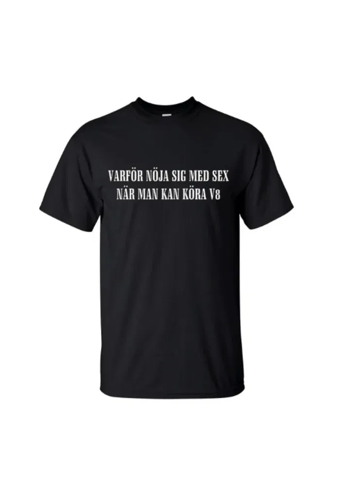 Beskrivning av T-shirt Varför nöja sig med sex när man kan köra V8